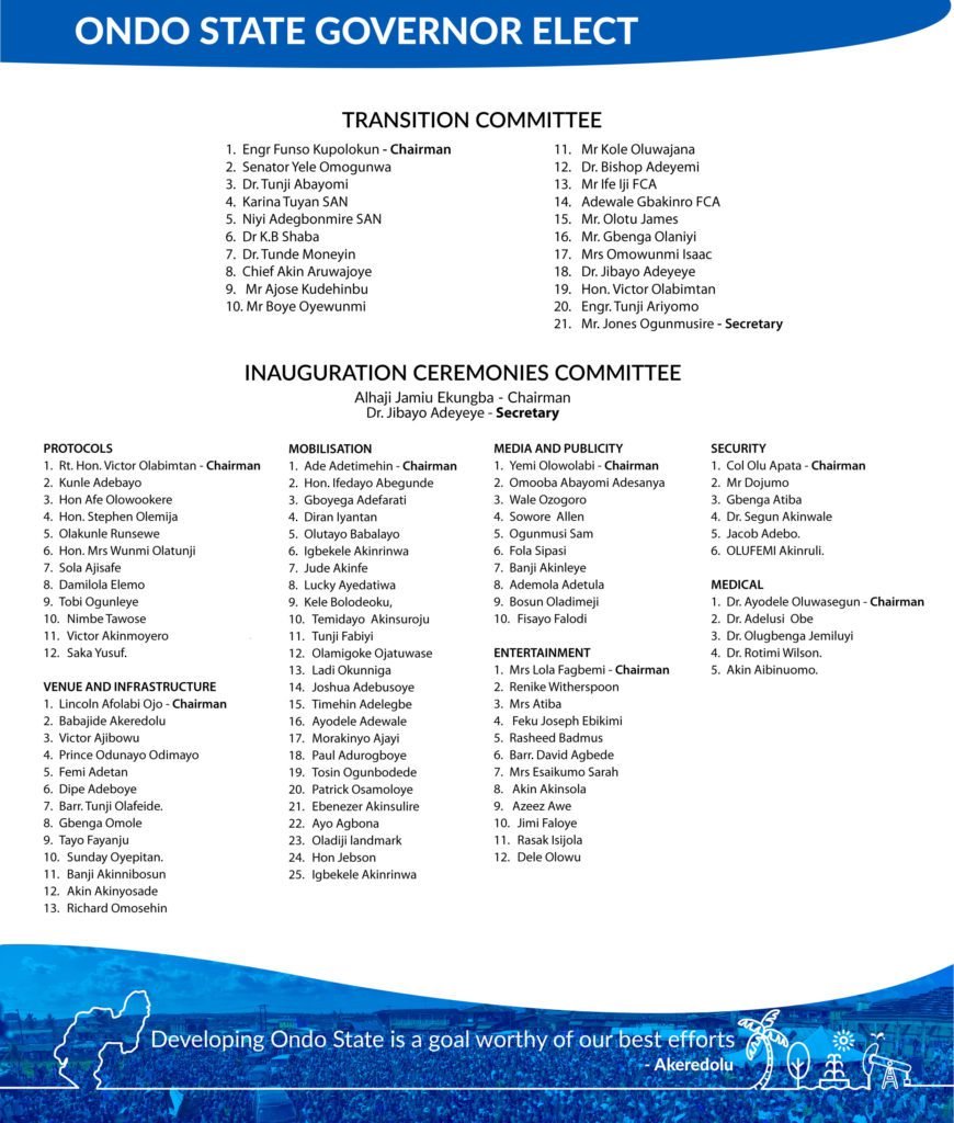 Ahead of the February 24 inauguration of the new government in Ondo State, the new governor-elect in the state, Mr Rotimi Akeredolu, on Thursday, inaugurated transition committees in preparation for the taking over the administration of the state.