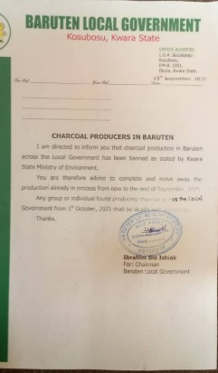 “You are, therefore, adviced to complete and move away the production already in process from now to the end of September. Any group or individual found producing charcoal in the local government from 1 October, 2025 shall be dealt with,” the notice read.